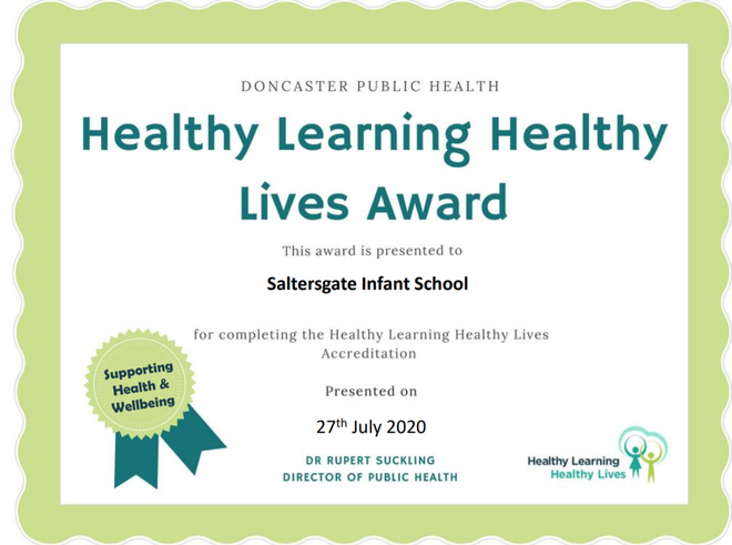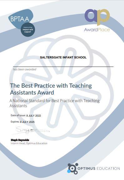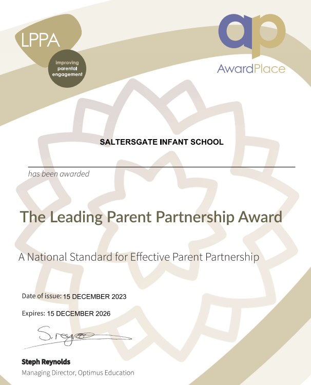 At Saltersgate Infant school we work hard to ensure that we develop and improve the provision for our children and parents. This is evidenced by the awards we have received, developed and sustained. We are proud of our success in achieving: