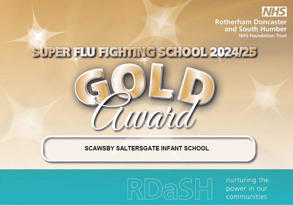 We are very pleased to announce that Saltersgate Infant School has been awarded a Gold award from the NHS for participating in the flu programme 2022/2023.